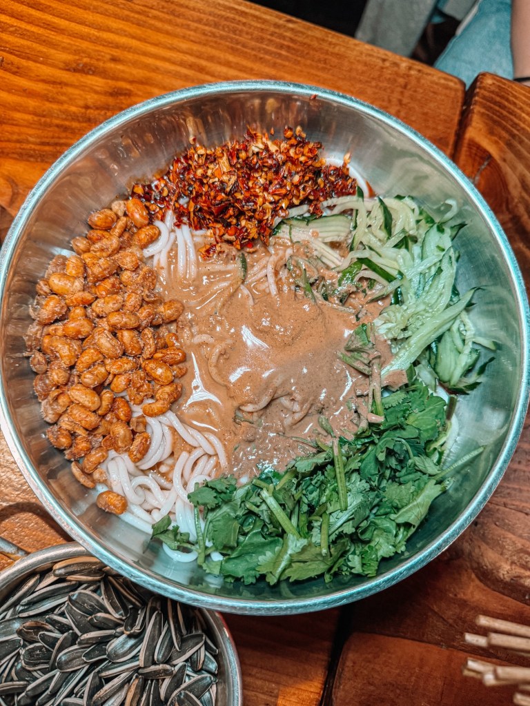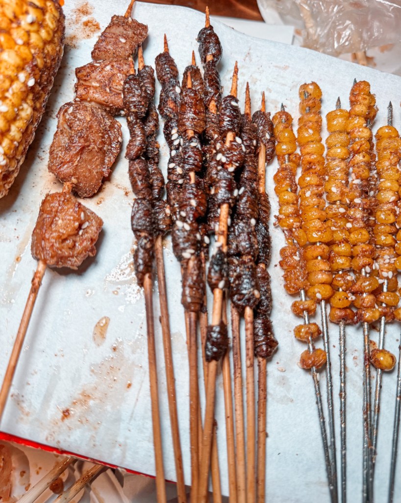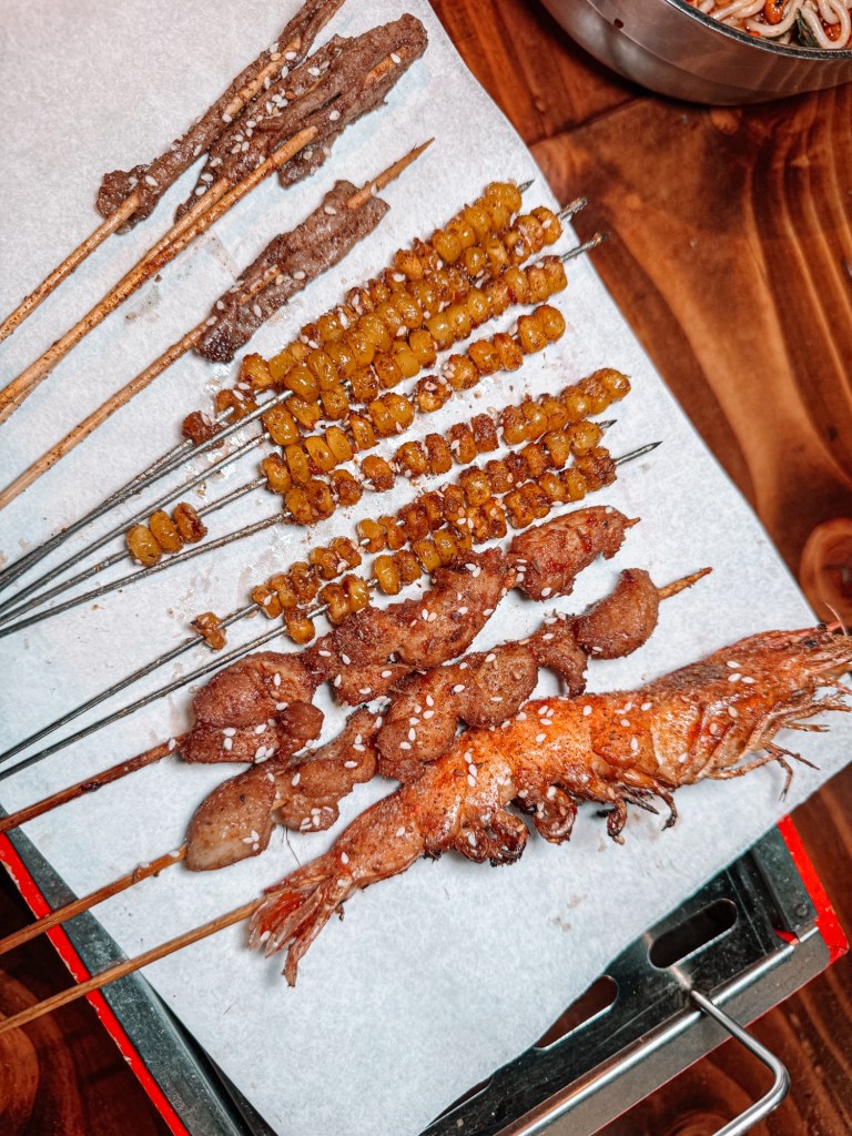 We also sampled a variety of kabobs: from big lamb and pepper beef to chicken skin and squid. My favorite? The corn kernel kabobs – crispy, sweet, and unlike anything I’ve tried before.